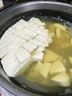 Douhua (Chinese: 豆花, 'tofu flower'), also referred as doufuhua (Chinese: 豆腐花), Sichuan Tofu, "flower" tofu,[1] is a type of food made from soybean milk after filtered, boiled with bittern water, and pressed until firm. It has a tender and solid texture, with a distinct taste of soybeans. It could also be made with mung beans. This food is especially popular in Southwestern China.[1]: 123.1