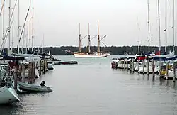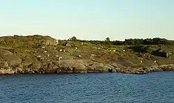 Åland is situated in an archipelago, called the Åland Islands, at the entrance to the Gulf of Bothnia in the Baltic Sea. It comprises Fasta Åland, on which 90% of the population resides,[11] and about 6,500 skerries and islands to its east,[12] of which about 60–80 are inhabited. Fasta Åland is separated from the coast of Roslagen in Sweden by 38 km (20+12 nautical miles) of open water to the west. In the east, the Åland archipelago is contiguous with the Finnish archipelago. Åland's only land border is located on the uninhabited skerry of Märket, which it shares with Sweden.[13] From Mariehamn, there is a ferry distance of about 160 km (86 nautical miles) to Turku, a coastal city of mainland Finland, and also to Stockholm, the capital of Sweden.