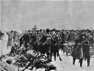 The bulk of the army marched out the next day, during a blizzard, with the battalions formed into squares in which the baggage and sick soldiers were escorted. A lot of supplies, provisions and sick soldiers were left behind due to the lack of horses. The Russians advanced rapidly during this time; a cavalry attack by Yakov Kulnev was repulsed by the Swedish rearguard-division.[4] However, the Södermanland battalion at Signilskär (475 men) and 87 Fleetwood jägers who were ordered to fight a delaying action, were cut-off and forced to surrender.[5] On 18 March, the bulk of the Swedish forces reached Grisslehamn on the Swedish mainland after having marched for 45–50 km (28–31 mi).[4]