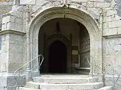 The Église Sainte-Geneviève de Loqueffret is a Roman Catholic parish church located at Loqueffret, situated in the arrondissement of Châteaulin and the department of Finistère in Brittany in north-western France. The parish church of Loqueffret was built in granite in the Gothic style in the 16th century and is dedicated to Saint Geneviève, a 10th-century Breton saint. The calvary dates to the 15th century. The existing bell-tower dates to 1771 and the bell-tower spire was designed by the architect Joseph Bigot and dates to 1850. The church has two large entrances on the west and south side.[1][2]