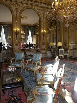 The Salon Doré (Golden Room) is named after the gold coloured edges to the wall features, doors, tables, and chairs. All the French Presidents have used this room as their main study except Valéry Giscard d'Estaing and Emmanuel Macron.[11]