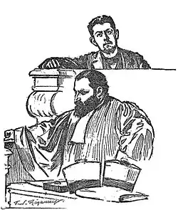 Moreover, his elder brother, Fortuné, became involved in the anarchist movement, where he established himself as a recognized speaker at anarchist meetings.[1] Émile assisted him in organizing these gatherings and gradually embraced anarchist ideas through his contact with and influence from his brother.[1] Henry likely joined anarchist circles around November 1890 and quickly became an active and 'able to act' militant. Well integrated into the anarchist network of the French capital, he spent the year 1891 engaging with Parisian anarchist circles.[5] He also began writing for a series of anarchist publications, such as l'Endehors[6] or probably also Le Forçat, where an "E. Henry" published in 1891.[7] In particular, he met Charles Malato, who quickly became one of his close friends and introduced him to smaller anarchist groups.[6] During this time, he worked in various jobs, which he performed fairly well. Malato noted his determined character—he would engage in anarchist discussions until late at night and still wake up early in the morning to go to work.[6]