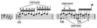 In Schumann's 1836 Neue Zeitschrift für Musik article on piano études,[20] the study, together with Op. 10, No. 3, is classified under the category "melody and accompaniment in one hand simultaneously." Cortot states that the attention of the student should be directed to perfecting polyphonic playing, an expressive intensity of tone and legato and believes that finding the individual tone for each of the simultaneous melodic lines is a particular difficulty.[21] He suggests to produce the tone of the upper part by pressing the keys to the bottom with firm and straight fingers. To ensure even action of the fingers playing the figure in semiquavers he recommends to start practicing in a non legato where the fingers do not lose contact with the key. For the final legato the weight of the hand should bear slightly on each semiquaver to produce a kind of portamento with a timbre that will not merge into the upper melodic line.[21] Cortot also introduces an exercise for flexibility of the foot to produce an "uninterrupted quivering" pedal, but advises to practice the finger legato first without pedal.[22] There are no original pedal marks by Chopin.