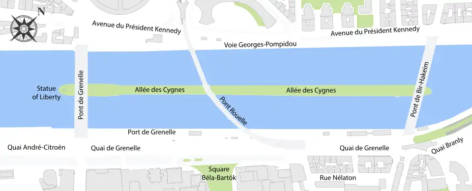 The uninhabited island is 850 metres (2,789 ft) long and 11 metres (36 ft) at its widest point, making it the third-largest island in Paris.[1] A tree-lined walkway, named L'Allée des Cygnes (Path of Swans), runs the length of the island.[2] Since 2012, there has been a public workout space with bicycles and a climbing wall underneath the Pont de Grenelle, close to a Statue of Liberty replica.[1]