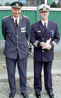 An officer wears a hat badge (mössmärke m/78 off) for the navy and another (mössmärke m/87 off) for amphibious units on the side cap (båtmössa m/48) and on the winter hat (vintermössa m/87).[14]