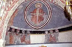 The chancel vault contains paintings of the apostles by the Åle Workshop. The ribbons of text include remnants from the Creed and the names of the apostles. On the chancel wall there are images of Anne and Mary with Jesus on her lap. Among the murals on the vaulting at the point where the transept crosses the nave, there are fragments of the story of Adam and Eve. The serpent in one of the scenes is shaped like the figure of a woman bearing an apple for Adam and Eve.[2]