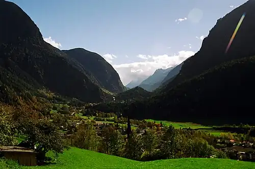 The Ötztal (German: [ˈœt͡sˌtaːl] ⓘ)[1] is an alpine valley located in Tyrol, Austria. The Ötztaler Ache river flows through the valley in a northern direction. The Ötztal separates the Stubai Alps in the east from the Ötztal Alps in the west. The valley is 65 km (40 mi) long. The northern end of the valley is at the confluence of the Ötztaler Ache and Inn rivers, 8 km east of Imst and 50 km west of Innsbruck. The only railway station of the valley, Ötztal railway station, is located here and connects the Ötztal with the Arlberg railway (Innsbruck-Bludenz) and also a motorway interchange to the A12 (E60).