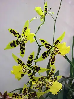 × Brassidium, abbreviated in trade journals Brsdm, is an artificial intergeneric hybrid between the orchid genera Brassia and Oncidium (Brs x Onc).[1][2] When Cochlioda and Odontoglossum are sunk into Oncidium, × Maclellanara (Mclna.), × Odontobrassia (Odbrs.) and × Sanderara (Sand.) are synonyms.