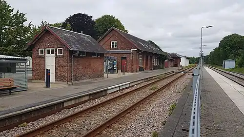 Like the other stations on the Esbjerg–Struer railway line, the still existing station building from 1875 was built to designs by the Danish architect Niels Peder Christian Holsøe (1826–1895), known for the numerous railway stations he designed across Denmark in his capacity of head architect of the Danish State Railways.[5]