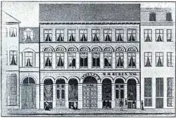 Ruben's property was home to 47 residents in eight households at the 1860 census. M. M. Ruben resided in the building with his wife Hanne Ruben (mée Eichel, 1807–1887), their three children (aged 17 to 24), one male servant and two maids.[18] Anna Maria Jordening (née Birch), a widow porcelain retailer, resided in the building with her six children (aged four to 19), a maid and a nanny.[19] Georg Ludvig Drimor, am ironmonger (issenlræmmer), resided in the building with two employees and an apprentice.[20] C. A. Martens, a glovemaker, resided in the building with his wife Marie Martens, their two sons (aged one and four), an apprentice and a maid.[21] Carl T. Thomsen, a butler (lejetjener), resided in the building with his wife Marn?? Thomsen and one maid.[22] Niels Petersen, a master tailer, resided in the building with his wife Johanne Petersen, their eight-year-old daughter and one maid.[23] Werner Lassen (1822–18855), a piano manufacturer, resided in the building with his wife Emilie Lassen, their three children (aged one to five) and one maid.[24] Rasmus Andersen, a haulier, resided in the building with his wife Caroline Andersen, three male servants and one maid.[25]