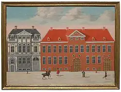 A larger property on the site was listed in Copenhagen's first cadastre of 1689 as No. 50 in Klædebo Quarter, owned by Annike Rosenkrantz. In 1699, it was divided into smaller properties. The property now known as Østergade 24 was later acquired by Secretary of War Michael Numsen. He constructed a large Baroque-style town mansion on the site. His property was listed in the new cadastre of 1756 as No. 50 in Købmager Quarter.[1] He was married to Margrethe Marie Thomasine Numsen.