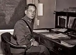 After his examen artium Øi took an officer exam attending the Norwegian Military Academy. He also did military studies in France.[1] Øi, a captain in the general staff, became known to the general public for his lecture entitled "Det strategiske overfall" ('The Strategic Attack') to the officers' society, Oslo Militære Samfund, on 6 March 1939.[2] In this lecture, Øi stated that Norway had inadequate defences and was vulnerable to a foreign attack. This caused a stir in some groups, especially the social democrat newspaper Arbeiderbladet, which came close to accusing him of treason.[3]