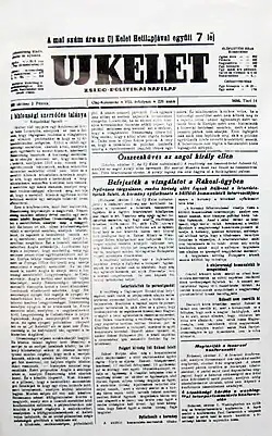 Új Kelet (pronounced [ˈuːj ˈkɛlɛt]; Hungarian translation: "New East") is a Hungarian-language Zionist Jewish newspaper published first in Kolozsvár (Cluj) in Transylvania, Romania in 1918. Prior to the annexation of Transylvania to Hungary in 1940 when it ceased publishing, it was the preeminent periodical for Hungarian-speaking Jewry in the world.[1] After an 8-year break from its final publication in 1940, it was reestablished in Tel Aviv, Israel in 1948.[1]