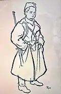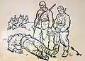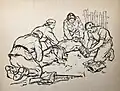 After waiting for two months Kun set off for southern France with smaller group, from where they crossed illegally into Spain. Immediately after his arrival, he underwent military training, during which he was chosen as the commander of Yugoslav volunteers. After completing the training, they were assigned to the International Battalion Đuro Đaković and sent to the front in Albacete. During his stay on the front line, in addition to participating in battle, he made drawings with motifs from the war. Later, at the insistence of Božidar Maslarić and Rodoljub Čolaković, he was transferred to the battalion headquarters. Later, as a cultural worker, he was transferred to the Headquarters of the 129th International Brigade. In Spain, he collaborated with Croatian journalist and writer August Cesarec and made seven drawings to illustrate his manuscript, published in Toronto in 1938 under the title Spanish Encounters (Španjolski susreti), a book of encounters with people and cities. In May 1938, by order of the KPJ, he was transferred from the front in Teruel to Barcelona, where he was informed that he had to return to Paris. In Barcelona, he had a meeting with Kosta Nađ. As he had no documents, he had to cross the border illegally.[15]