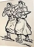 While an apprentice in his father workshop, Đorde liked to socialise with the workers, and he subsequently joined the Association of Graphic Workers.[9] In 1923 he painted a poster for the International Workers' Day celebration, which was printed and put up around the city and in streetcars. Kun's interest in left-wing ideas and communism most likely arose during his stay in Paris, where he received books on Lenin and the Soviet Union from friends. Through his wife Nada he began to associate with communists and members of the then illegal Communist Party of Yugoslavia (KPJ). Left-wing ideas did not affect his artistic expression prior to 1934. The conference of the International Association of Revolutionary Writers, held in 1930 in Kharkiv, and the First Congress of Soviet Writers, held in August 1934 in Moscow, defined the concept of socialist realism, an artistic style with the aim of spreading communist and socialist ideas, which highly influenced Kun's artistic output from that point onwards.[1][7]