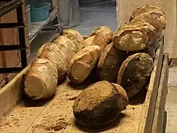 Maltese bread (Maltese: Il-Ħobż tal-Malti, tal-malti) is a crusty sourdough bread from Malta, usually baked in wood ovens.[1] It is typically eaten with spread olive oil (Ħobż biż-żejt), where the bread is rubbed with tomatoes (as with the Catalan pa amb tomàquet) or tomato paste, drizzled with olive oil and filled with a choice or mix of tuna, olives, capers, onion, bigilla and ġbejna.[2] The practice of making the bread is considered a 'dying art'.[3]