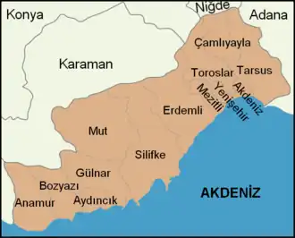 - ^ İçel: Mersin- Tarsus- Çamlıyayla- Erdemli- Silifke- Aydıncık- Bozyazı- Anamur- Gülnar- Mut (Kültür, Turizm ve Tanıtım yayınları, 1992), p. 7.