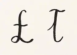 In normal typefaces, the letter has a stroke approximately in the middle of the vertical stem, crossing it at an angle between 70° and 45°, never horizontally. In cursive handwriting and typefaces that imitate it, the capital letter has a horizontal stroke through the middle and looks very similar to the pound sign £. In the cursive lowercase letter, the stroke is also horizontal and placed on top of the letter instead of going through the middle of the stem, which would not be distinguishable from the letter t. The stroke is either straight or slightly wavy, depending on the style. Unlike ⟨l⟩, the letter ⟨ł⟩ is usually written without a noticeable loop at the top. Most publicly available multilingual cursive typefaces, including commercial ones, feature an incorrect glyph for ⟨ł⟩.[1]