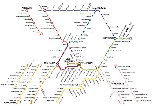 The Railway operates services to destinations between Łódź and the following towns and cities: Koluszki, Kutno, Łowicz, Sieradz, Skierniewice, Zgierz.