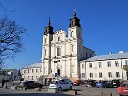 ![]() From top, left to right: Collegiate church of Transfiguration, Exaltation of the Holy Cross church, town hall, 18th-century building of boarding school, currently Regional Museum, railroad station, Zimna Woda Reservoir | |