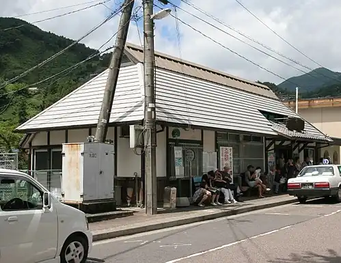 A bus stop for buses operated by the Shikoku Transportation Company or Miyoshi city bus is located near the front entrance of the station.[8]