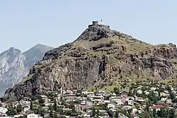 Şebinkarahisar Castle is located atop of a 1,360 m (4,460 ft)-high hill named Hacikayası southeast of Şebinkarahisar town in Giresun Province, northern Turkey. It is assumed that the castle existed during the Kingdom of Pontus before the Roman Empire period.[1][2] Some parts of the castle walls in the north and southeast show traces of extensive repairs carried out during the reign of Roman emperor Justinian I (r. 527–565).[2] Most of the castle walls were built during the Anatolian beylik of Mengujekids. It is stated that Ruler Fahreddin Behram Shah (1162-1225) made important additions to the castle in 1184. An inscription from the Mengujekids period featuring a relief of double-headed eagle, originally situated over the castle gate, was removed in 1896 and stolen It was later found, and sent to the Governor of Sivas Province.[1][2]
