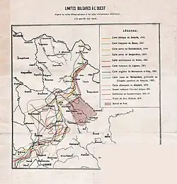 {{cite book}}: CS1 maint: location missing publisher (link) - ^ Other of the evidences, again both foreign and native, follow from 1870 on after the creation of the Bulgarian Exarchate; after the decisions of an European conference in Constantinople (Dec. 1876 — Jan. 1877) for creating two autonomous Bulgarian provinces from the line Timok—Nish—Gnilane—Debar—Kostur, toward the east to the Black sea below Lozengrad; For more see: Johann Georg von Hahn, Bulgarians in Southwest Morava, reissued by Aleksandar Teodorov-Balan (1917) Al. Paskaleff & Co. publishers, Sofia, pp. 26-27.