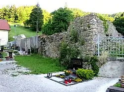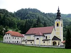 Next to the church can be seen the ruins of what was the Špitalič (Neuthal) Mansion. Part of the Carniolan estates held by the Counts of Andechs, the structure was originally a hospice offering shelter to the many travelers passing through the valley. It was built by the Andechs margrave Henry II of Istria about 1228, passing to Viktring Abbey circa 1251.[3] It was sold and converted into a mansion in 1608 and subsequently rebuilt a number of times.[7] The mansion was burned by the Yugoslav Partisans in January 1945.[3]