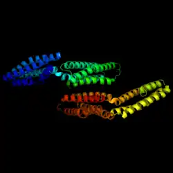 α-Catenin (alpha-catenin) functions as the primary protein link between cadherins and the actin cytoskeleton.[1] It has been reported that the actin binding proteins vinculin[2] and α-actinin[3] can bind to alpha-catenin. It has been suggested that alpha-catenin does not bind with high affinity to both actin filaments and the E-cadherin-beta-catenin complex at the same time.[4] It has been observed that when α-catenin is not in a molecular complex with β-catenin, it dimerizes and functions to regulate actin filament assembly,[5] possibly by competing with Arp2/3 protein.[6] α-Catenin exhibits significant protein dynamics.[7] However, a protein complex including a cadherin, actin, β-catenin and α-catenin has not been isolated., although some progress has been made.[8][9]