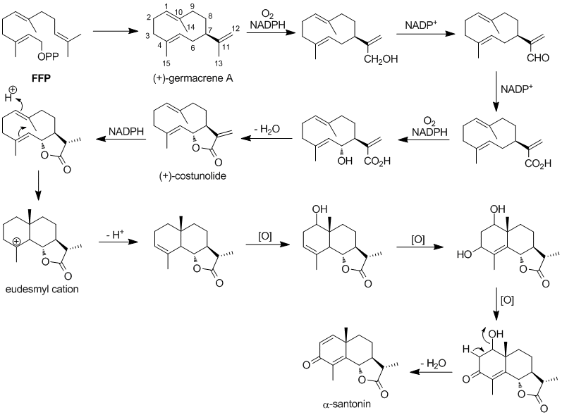 The full biosynthesis of α-santonin has not been elucidated but α-santonin bears much similarity to parthenolide. The proposed biosynthesis begins with the cyclization of farnesyl diphosphate (FPP) to (+)-germacrene A by a sesquiterpene synthase. (+)-germacrene A hydroxylase then hydroxylates the isopropenyl side chain. The oxidation of germacratrien-12-ol to germacratrien-12-oic acid via the intermediate germacratrien-12-al is done by NADP+-dependent dehydrogenase(s). Germacratrien-12-oic acid is then hydroxylated at C6 subsequently followed by lactonization forming (+)-costunolide.[14]