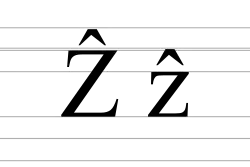 Ẑ is a Latin script letter, the letter Z with a circumflex, used for transliteration of the Cyrillic letter Ѕ in ISO 9 family of transliteration standards, and rarely used in Pinyin as a shorthand of zh.[1] It is also used in Poliespo for the sound /kts/, and in the Tsilhqotʼin language to represent /ẕˤ/.