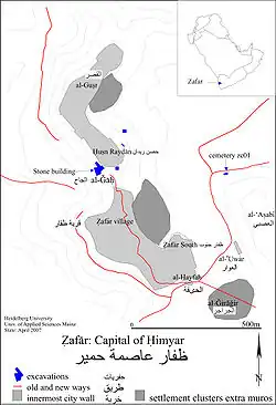 Ẓafār (Arabic: ظفار), also Romanized Dhafar or Dhofar, is an ancient Himyarite site situated in Yemen, some 130 km south-south-east of today's capital, Sana'a, and c. 10 kilometres (6.2 mi) south-east of Yarim. Given mention in several ancient texts, there is little doubt about the pronunciation of the name.[1] This site in Yemen is far older than its namesake in Oman.[2] It lies in the Yemeni highlands at some 2800 m. Zafar was the capital of the Himyarites (110 BCE – 525 CE), which at its peak ruled most of the Arabian Peninsula.[3] For 250 years the tribal confederacy and allies' combined territory extended past Riyadh to the north and the Euphrates to the north-east.