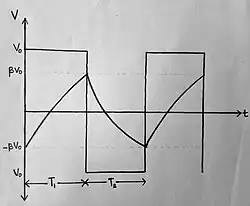 We are taking values of R, C and β such that we get a symmetrical square wave. Thus, we get T1 = T2 and total time period T = T1 + T2. So, the time period of the square wave generated at the output is:
