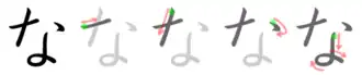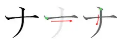 な, in hiragana, and ナ, in katakana, are Japanese kana, which each represent one mora. The hiragana な is made in four strokes, the katakana ナ two. Both represent [na]. な and ナ originate from the man'yōgana 奈. な is used as part of the okurigana for the plain negative forms of Japanese verbs, and several negative forms of adjectives.