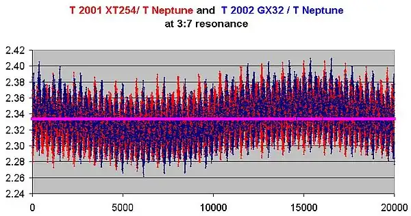 Simulations by Emelʹyanenko and Kiseleva in 2007 show that 2002 GX32 has a 99% probability of libration in a 3:7 resonance with Neptune.[7]