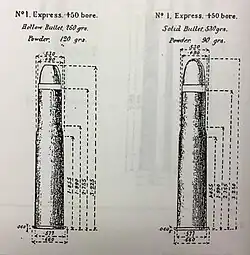 The .500/450 No. 1 Black Powder Express was a rimmed, bottlenecked cartridge designed for use with black powder. The cartridge was originally designed as a deer stalking round with a 260 gr (17 g) bullet, although later a 530 gr (34 g) loading was produced for target shooting.[1][2]