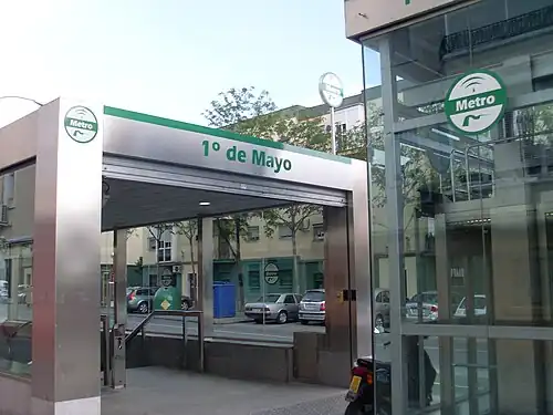 1º de Mayo (English: 1 May) is a station of the Seville Metro on line 1.[1] It is located at the intersection of Federico Mayo Gayarre and Ronda del Tamarguillo avenues in the district of Cerro-Amate. 1º de Mayo is an underground station situated between Gran Plaza and Amate on the same line. It was opened on 2 April 2009. It was expected that by 2017 the station will have a connection with line 4 of the subway (that was in planning phase).