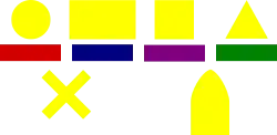 The practice of wearing battalion specific insignia (often called battle patches) in the B.E.F. began in mid 1915 with the arrival of units of Kitchener's Armies and was widespread after the Somme Battles of 1916.[13] The patches shown were worn by the division during 1917 and 1918.[14] There was an overall division scheme for the battle patches, colours for each brigade and shapes for each battalion.[15] This division also identified the companies within each battalion with an oblong coloured red for A company, dark blue for B Coy, purple for C Coy and green for D Coy, which could be worn above or below the battalion patch, as shown below. The patches were worn on both sleeves.[16]