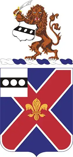 The shield is blue for Infantry. The saltire is for the American Civil War service and the fleur-de-lis for World War I service. The canton represents the shield that appeared on the "Associators'" flag, indicating the Revolutionary War service of the organization. The silver saltire has been voided with red in similitude to the colors of the uniforms of the Pennsylvania troops as prescribed by General George Washington in 1779. The motto was used by the 3d Infantry, Pennsylvania National Guard, for a number of years