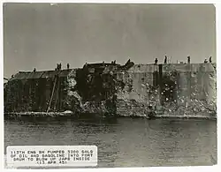 This left Fort Drum as the last position in Manila Bay held by the Japanese. It was a nearly impenetrable fortress built by the United States in 1909, with 6 meter (20-ft) thick reinforced concrete walls and four 14-inch turret guns. After heavy aerial and naval bombardment with little result, a detachment from the 113th Engineers and F Company, 151st Infantry Regiment were assigned to neutralize Fort Drum. The 113th Engineers altered their technique, using TNT and incendiary grenades to detonate the diesel/gasoline mixture that was pumped into a vent. The explosion ejected a 1-ton hatch 300 ft (91m) into the air and blew out parts of the fort's reinforced concrete walls. The fall of Fort Drum marked the end of Japanese resistance in Manila Bay.