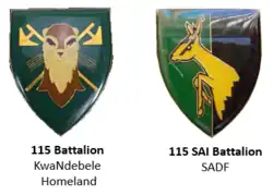 115 Battalion's badge was initially designed for its role in the KwaNdebele Defence Force. The axes and otter are symbols of the Ndebele people. The redesigned 115 SAI Battalion badge however removed any direct connotation to the Ndebele tribe and was opened up as a multi-ethnic unit while the South African Infantry colours was introduced.