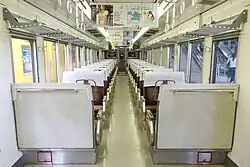 In order to increase the capacity of the cars and make boarding and alighting easier, transverse seating immediately inside the doors was converted to longitudinal seating. This helped to reduce the problem of rush hour trains being delayed due to the time needed for passengers to board and alight. Brakes were augmented, and the livery associated with the Fukuchiyama Line, white with green striping, appeared.