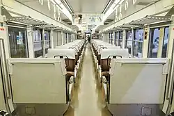 All 117 series cars were originally equipped with reversible transverse seats, but lacked strap hangers. The interior had wood trim intended to set the 117 apart from other suburban trains. The cars feature flat ceilings joined to the walls and an angled panel above the luggage rack.