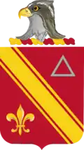 The shield is that of the old 56th Artillery, C.A.C., of which three batteries of the 11th Coast Artillery were a part; Headquarters, A, and C Batteries. The silver triangle was the insignia for the 56th Artillery in France. The fleur-delis was taken from the coat of arms of the old Province of Ile de France, where the regiment first went into action. The crest is taken from the old Coast Defenses of Long Island Sound. The motto translates to "Daring and Vigilant" and is applicable to a Coast Artillery Regiment and is quite symbolic of the fish hawk or osprey, which is a very daring and vigilant bird.