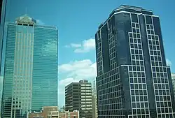 The 1201 Walnut Building is a skyscraper located in Downtown Kansas City, Missouri, US, built by HNTB Architects in 1991.[3] It is located at the southeast corner of 12th and Walnut streets, one block North of the Power & Light District and one intersection East of One Kansas City Place. At 427 feet, it is the eighth tallest habitable structure in the Kansas City Metropolitan Area and the twelfth-tallest habitable structure in Missouri. The exterior is made of mostly dark-colored glass with granite panels. In late 2010, building tenant Stinson Leonard Street, LLP, acquired the rights to place a large sign and corporate logo atop the southern face of the building.