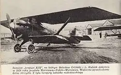 In the spring of 1925, the 113th Fighter Squadron was formed as a part of the 11th Fighter Regimenet in the Mokotów Airport. It was equipped with 13 Ansaldo A.1 Balilla fighter planes. The squadron soon received Blériot SPAD 61C1 fighter planes. At the end of 1925 the squadron was transferred to Lida Airport.[1] In 1926, Lieutenant Pil, Bolesław Orliński and aircraft mechanic Leonard Kubiak of the squadron flew from Warsaw to Tokyo and back to Warsaw in 121 hours, covering 22,600 kilometres (14,000 mi) in a Bréguet 19 B.2.[1] In 1928, the 11th Air Regiment was disbanded and 113th Fighter Squadron was transferred to the 2nd Air Regiment and was redesignated as the 121st Fighter Escadrille.