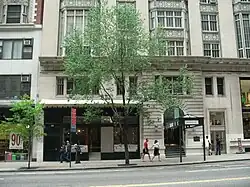 The base is composed of the first and second stories. At the base, the central bay contains a slightly projecting entrance pavilion clad with rusticated and vermiculated limestone blocks.[14] Within this entrance pavilion is an arch with voussoirs flanking a volute above the top of the arch, and a double door approached from a small stoop.[15] A metal and glass canopy, installed in 2000, extends from the entrance into the sidewalk.[16] The remainder of the base contains storefronts or store entrances on the first story. The westernmost wide bay contains a double-height display window, while the other second-story bays contain either pairs of sash windows or multi-pane rectangular windows. Atop the second story is a projecting terracotta cornice, which contains a frieze with alternating circles and triglyphs, as well as a pattern of mutules alternating with rosettes or lozenges on the underside of the cornice.[17]