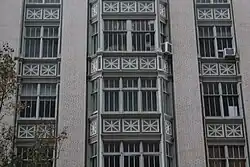The twelve upper stories are similar in design to each other and contain several types of windows. The windows in the outermost wide bays, and on the third through tenth stories of the center bay, project slightly from the facade and contain trapezoidal frames. The outermost bays contain double-height windows. The windows in the narrow bays, and in the eleventh through fourteenth stories of the center bay, do not project. In all bays, there are geometric olive-painted spandrels between the windows on each story, and the windows have olive mullions. There is another cornice above the fourteenth story, with modillions beneath it. The cornice rests on six large pairs of iron brackets, which are aligned with the tops of the brick piers.[17]