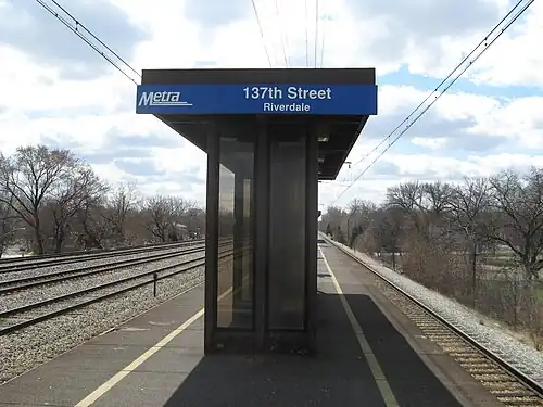 Riverdale is one of two commuter rail stations on the Metra Electric main branch in Riverdale, Illinois, a village just southwest of the adjacent Riverdale neighborhood of Chicago, Illinois. The station is located at 137th Street and Illinois Street, and is 17.3 miles (27.8 km) away from the northern terminus at Millennium Station.[2] In Metra's zone-based fare system, Rivedale is in zone 2. As of 2018, Riverdale is the 172nd busiest of Metra's 236 non-downtown stations, with an average of 146 weekday boardings.[1]