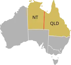 In Australia, the border between the Northern Territory and Queensland approximates the meridian. The border runs north from Poeppel Corner at a bearing of 359° 59' 30", reaching the Gulf of Carpentaria several hundred meters west of the meridian.[2]